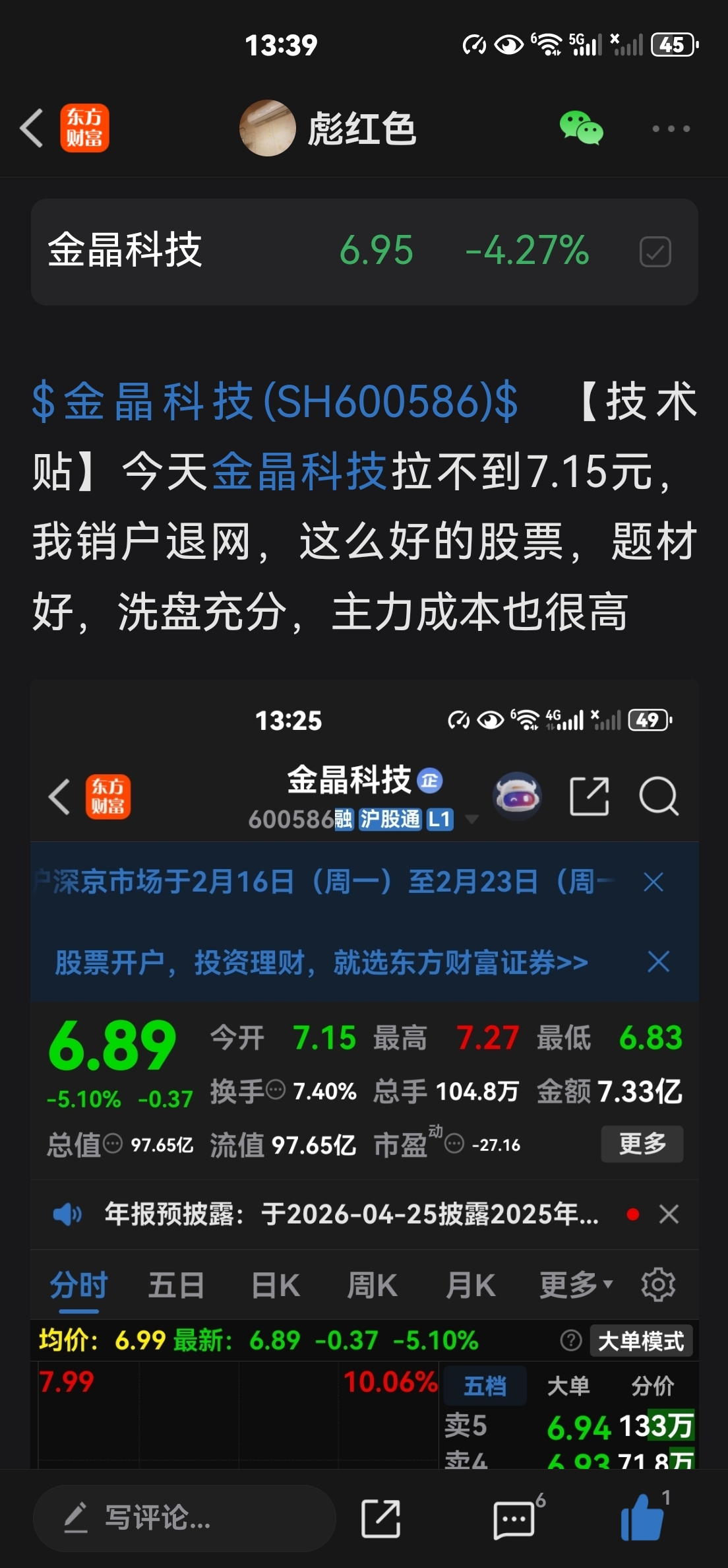 温馨提示: 1.根据《证券法》规定,禁止编造、传播虚假信息或者误导性信息,扰乱证券市场;2.用户在本社区发表的所有资料、言论等仅代表个人观点,与本网站立场无关,不对您构成任何投资建议。用户应基于自己的独立判断,自行决定证券投资并承担相应风险。《东方财富社区管理规定》