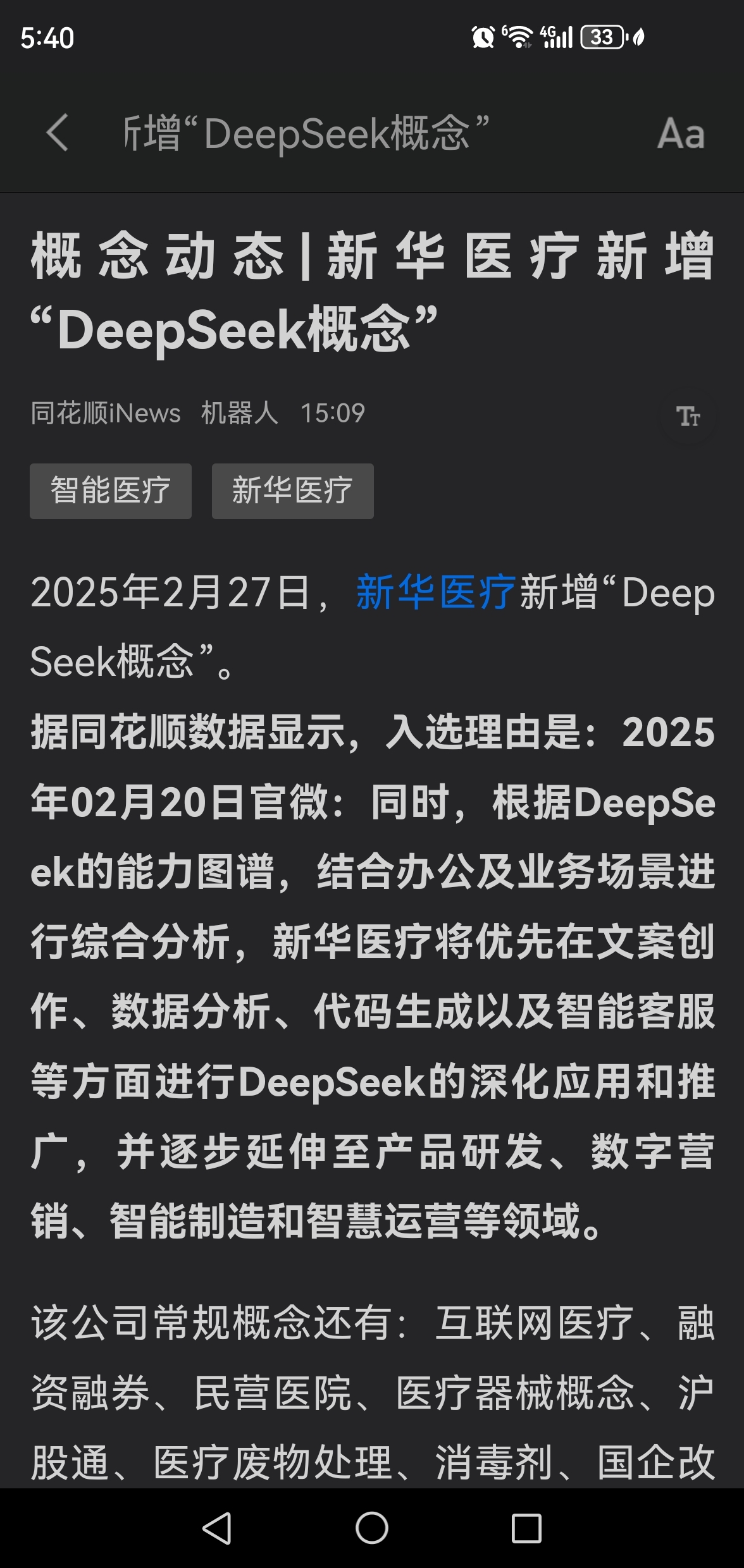$新华医疗(SH600587)$ 27号收盘后新增概念Deep-Seek概念
