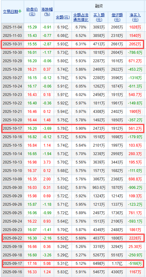 2025-11-04,融资余额占流通市值比6.70%。收盘15.29