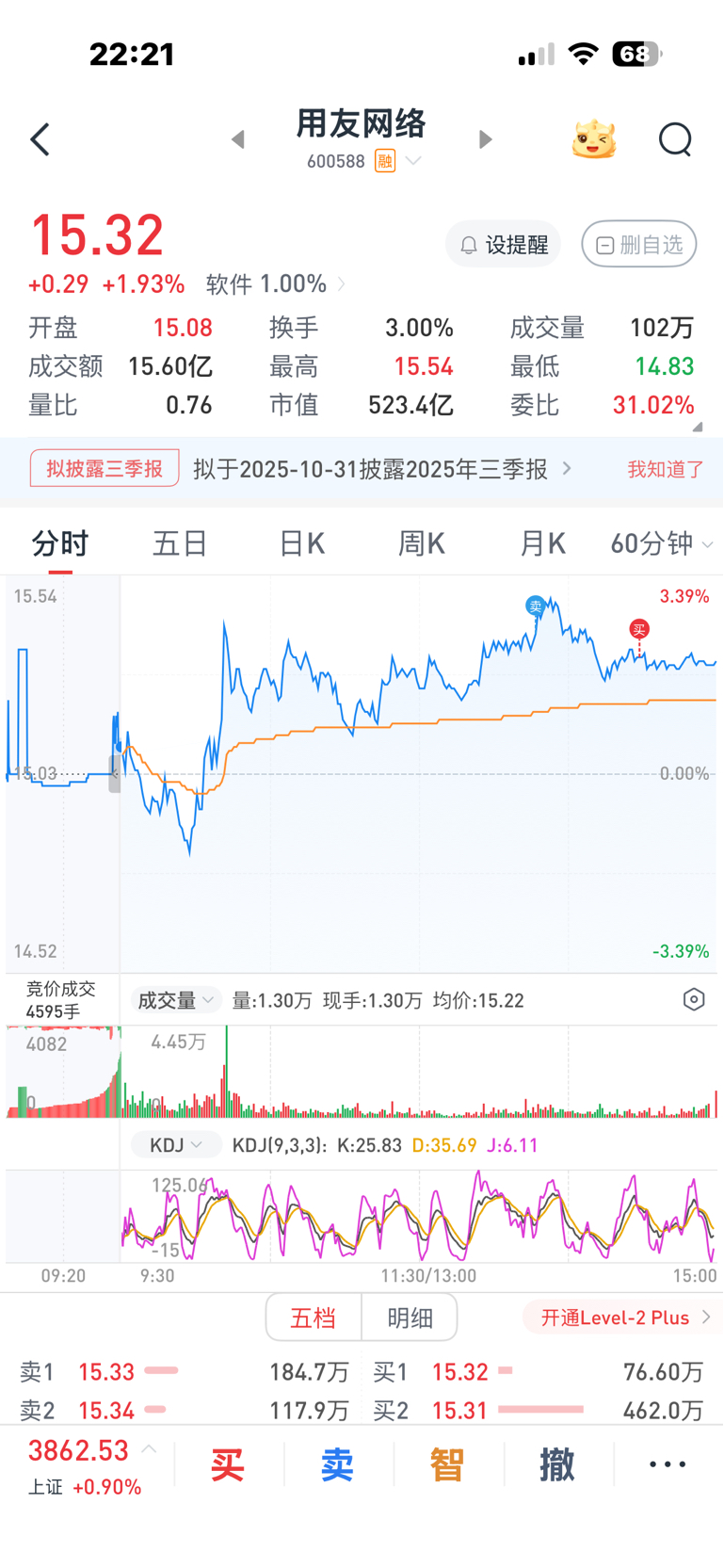 $用友网络(SH600588)$ 想卖1000股做个T,结果不知怎么变成5000股了,等回落接回了2000股,本来想着不跌破14.5就不补仓的,这次看明天给机会破15就接回来,不给机会就算了,把成本弄高了1毛3