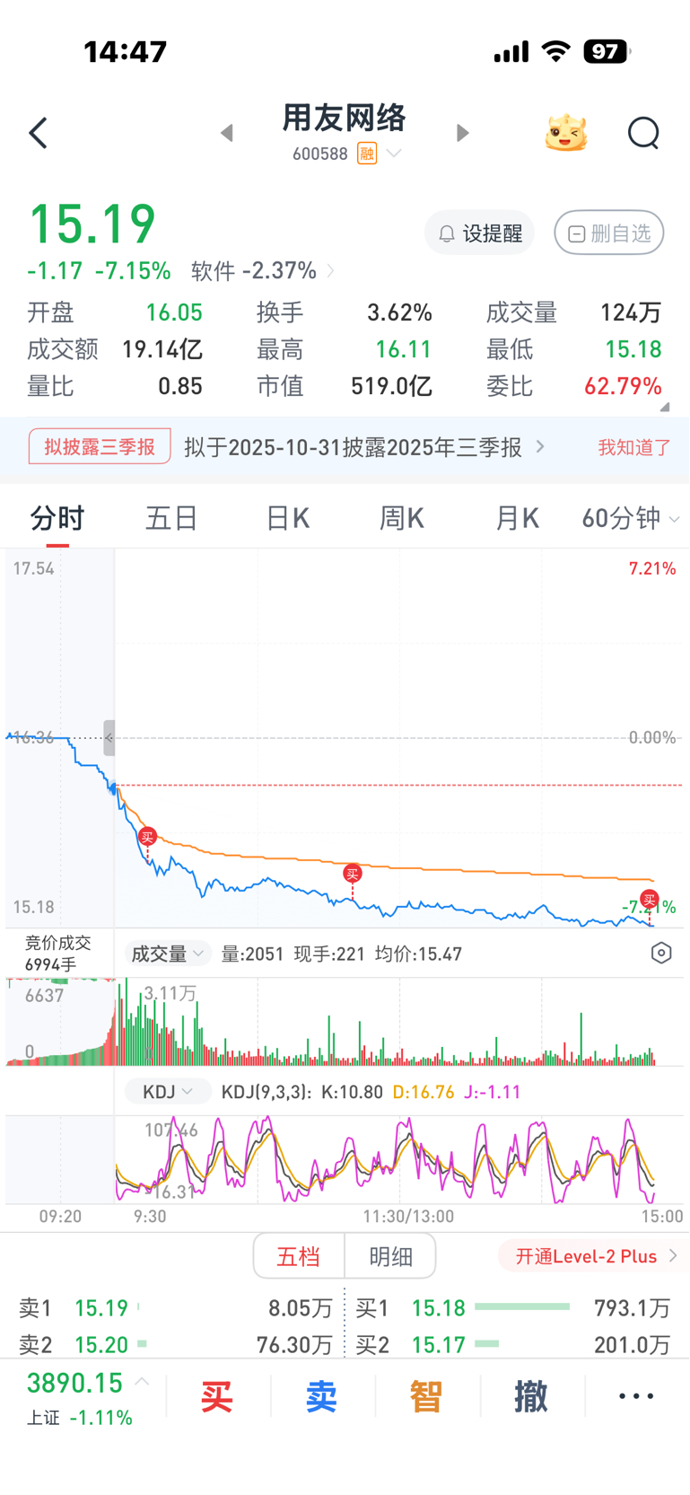 $用友网络(SH600588)$ 成本16.067,17000股~还有14个可以补~