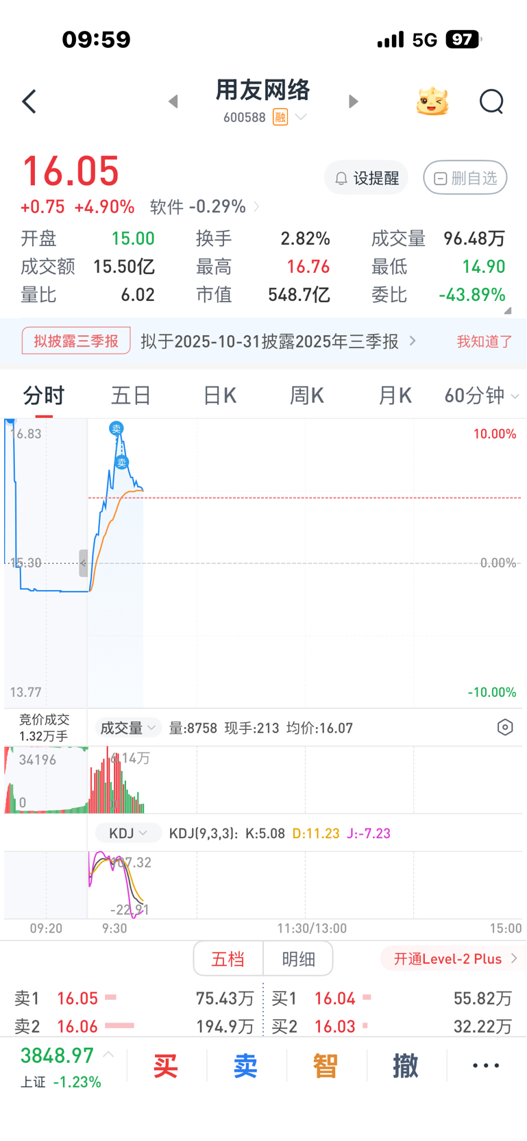 $用友网络(SH600588)$ 周五15块多买的4000股今天卖掉做个T