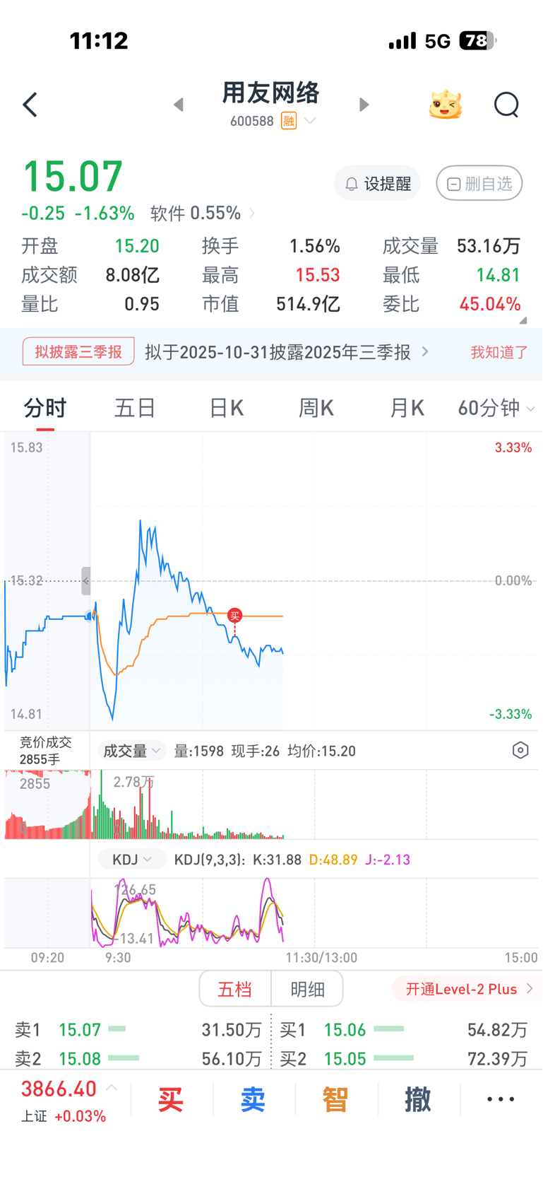 $用友网络(SH600588)$ 买了1000股,成本15.89元,15000股~