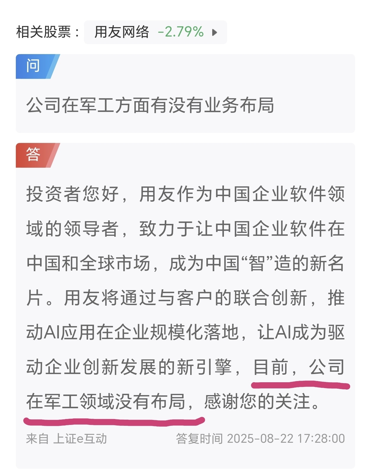 哪来的虚假小作文,公司8月22日《投资者问答》明确说了,“在军工领域没有布局”,