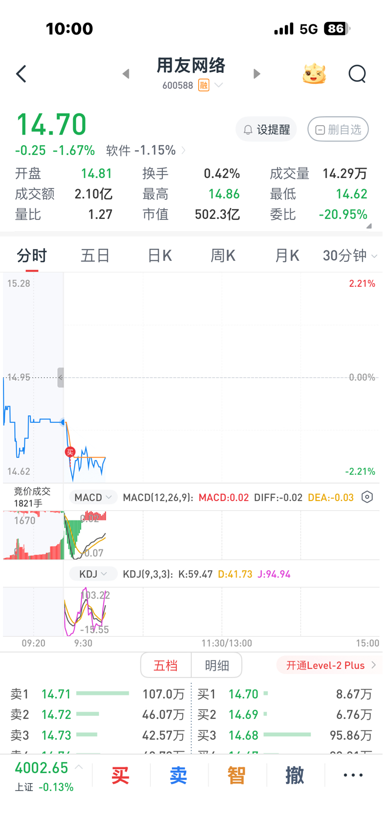 $用友网络(SH600588)$ 成本15.5,跌到14就满仓