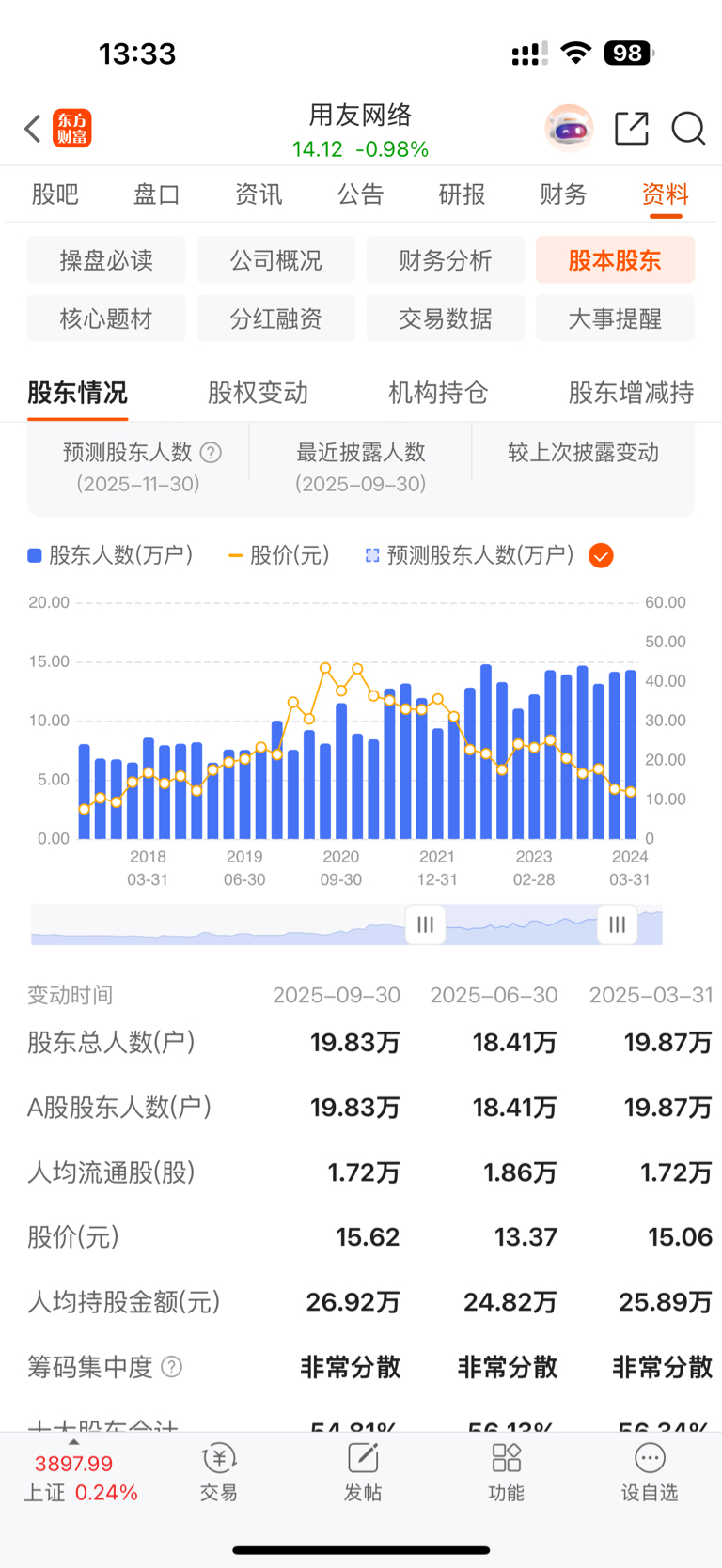 $用友网络(SH600588)$ 现在20万股东,什么时候股东下降到1万就有希望了。不知道这10万后面进来的,怎么想的,在这躲牛市吗?很有意思