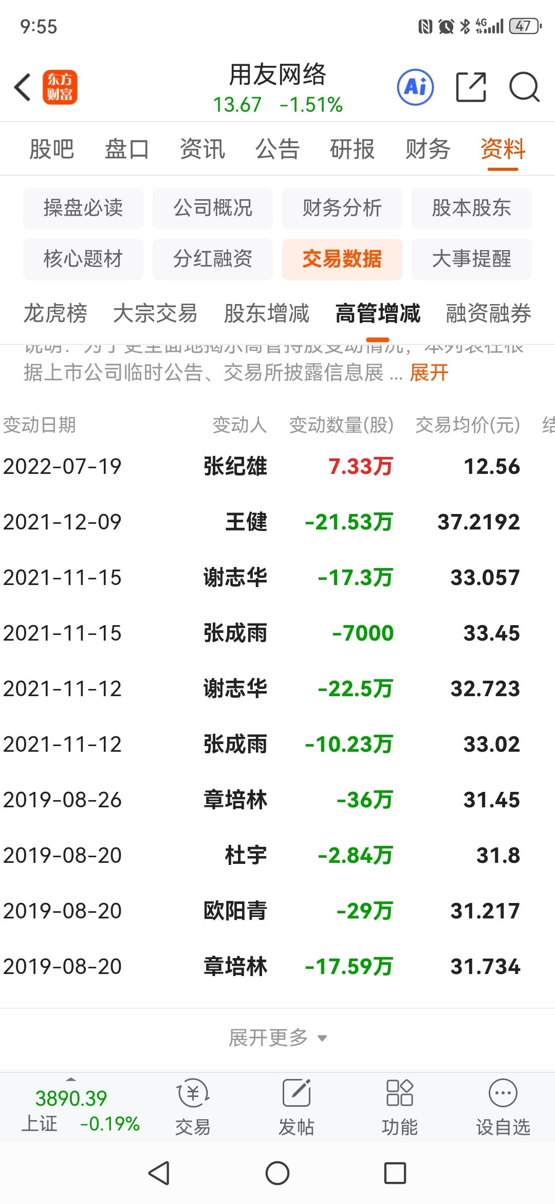 $用友网络(SH600588)$ 用友的高管也难受,不知道亲属账户怎么样,但是账面上已经3年没有增减持了。这是不看好自己家不增持,还是被王约束,不允许减持,悲哀呀。