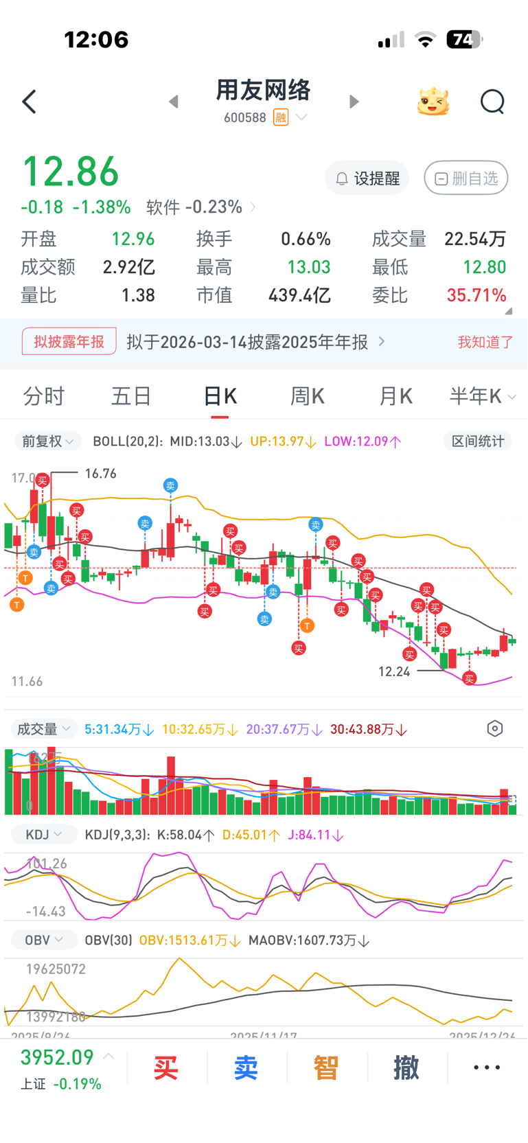 $用友网络(SH600588)$ 12.8好不容易上来了,别再跌破了,稳住啊~