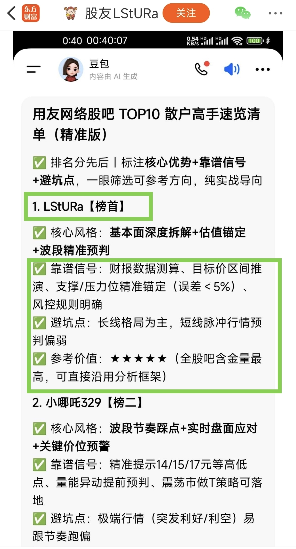 “股友LStURa”自封本吧老大,T一个点T出几顿饭就洋洋得意到处炫耀,弄了个用友网络吧散户高手排名。把自己排在榜首,打着技术分析的幌子,忽悠用友网络目标价60-80,25块以下只买不卖不T……