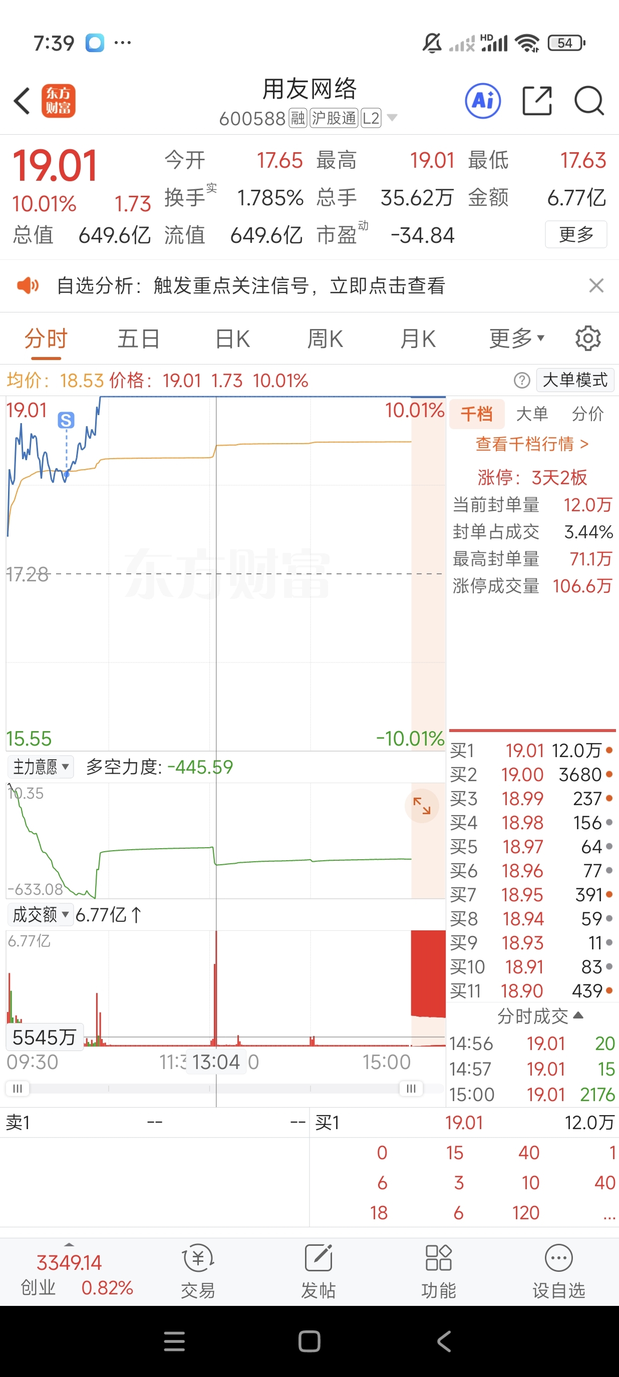 $用友网络(SH600588)$ 昨天破板了清仓,尾盘又买了回来,想着今天不封板就出了,结果卖在最低点,虽然也有56%的利润,但这股表现超出预料,明天还有机会接回来吗?