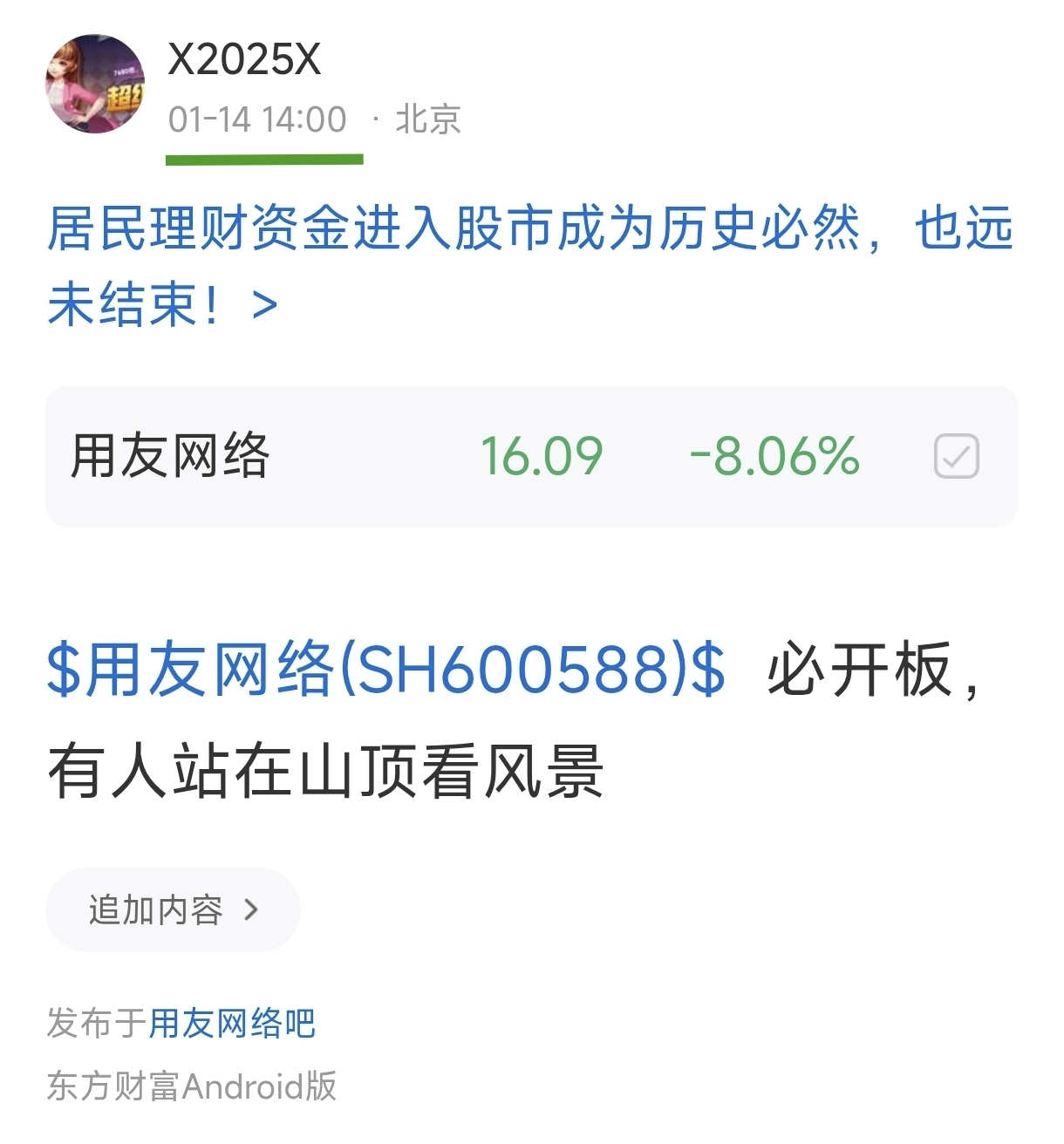 温馨提示: 1.根据《证券法》规定,禁止编造、传播虚假信息或者误导性信息,扰乱证券市场;2.用户在本社区发表的所有资料、言论等仅代表个人观点,与本网站立场无关,不对您构成任何投资建议。用户应基于自己的独立判断,自行决定证券投资并承担相应风险。《东方财富社区管理规定》