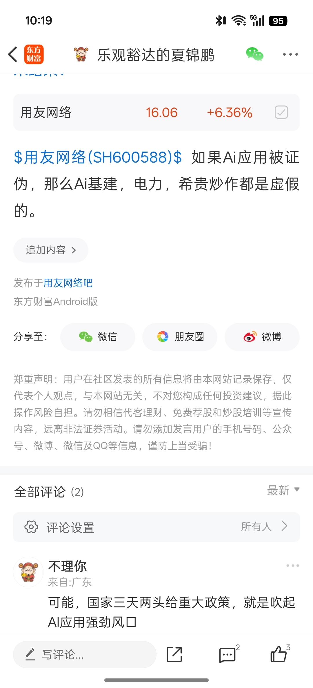 温馨提示: 1.根据《证券法》规定,禁止编造、传播虚假信息或者误导性信息,扰乱证券市场;2.用户在本社区发表的所有资料、言论等仅代表个人观点,与本网站立场无关,不对您构成任何投资建议。用户应基于自己的独立判断,自行决定证券投资并承担相应风险。《东方财富社区管理规定》