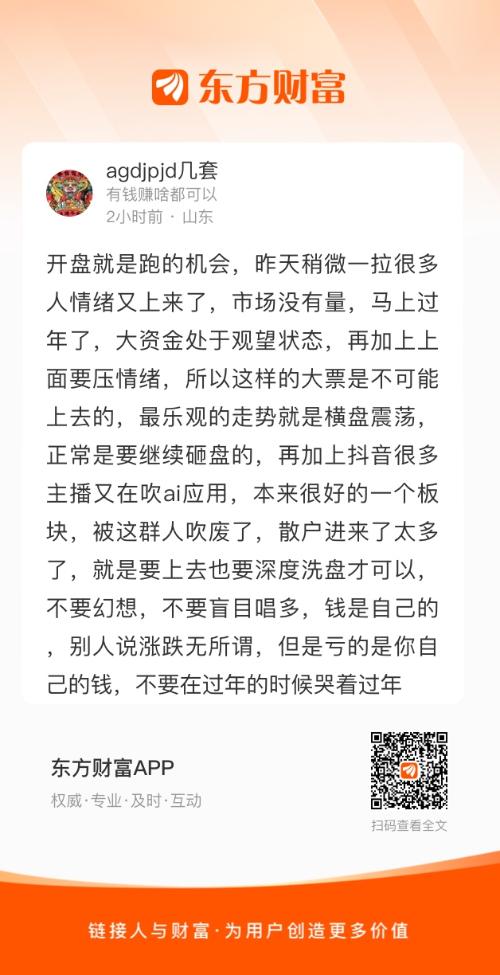 开盘就是跑的机会,昨天稍微一拉很多人情绪又上来了,市场没有量,马上过年了,大资金处于观望状态,再加上上面要压情绪,所以这样的大票是不可能上去的,最乐观的走势就是横盘震荡,正常是要继续砸盘的,再加上抖音很多主播又在吹ai应用,本来很好的一个板块,被这群人吹废了,散户进来了太多了,就是要上去也要深度洗盘才可以,不要幻想,不要盲目唱多,钱是自己的,别人说涨跌无所谓,但是亏的是你自己的钱,不要在过年的时候哭着过年