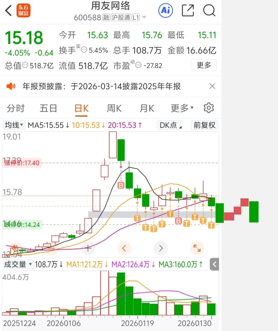 $用友网络(SH600588)$ 下周走势预测,补缺震荡,跌破十五