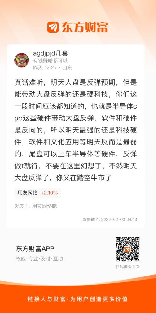 真话难听,明天大盘是反弹预期,但是能带动大盘反弹的还是硬科技,你们这一段时间应该都知道的,也就是半导体cpo这些硬件带动大盘反弹,软件和硬件是反向的,所以明天最强的还是科技硬件,软件和文化应用等明天反而是最弱的,尾盘可以上车半导体等硬件,反弹做t就行,不要在这里幻想了,不然明天大盘反弹了,你又在踏空牛市了
