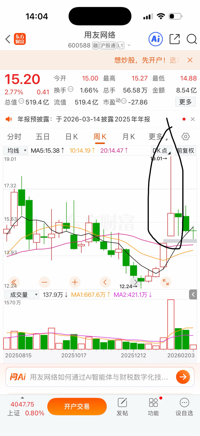 $用友网络(SH600588)$ 周线超级长上影没有几个月消化是不可能上得去的垃圾