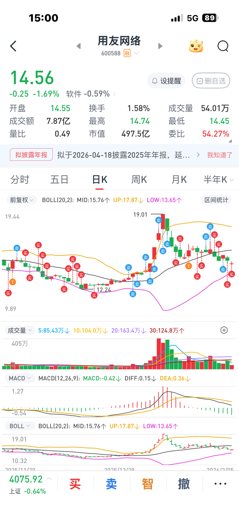 $用友网络(SH600588)$ 下边就是黄金坑,目前有8万块可以买~14块补一次,13.5补一次~13块以下无脑买~