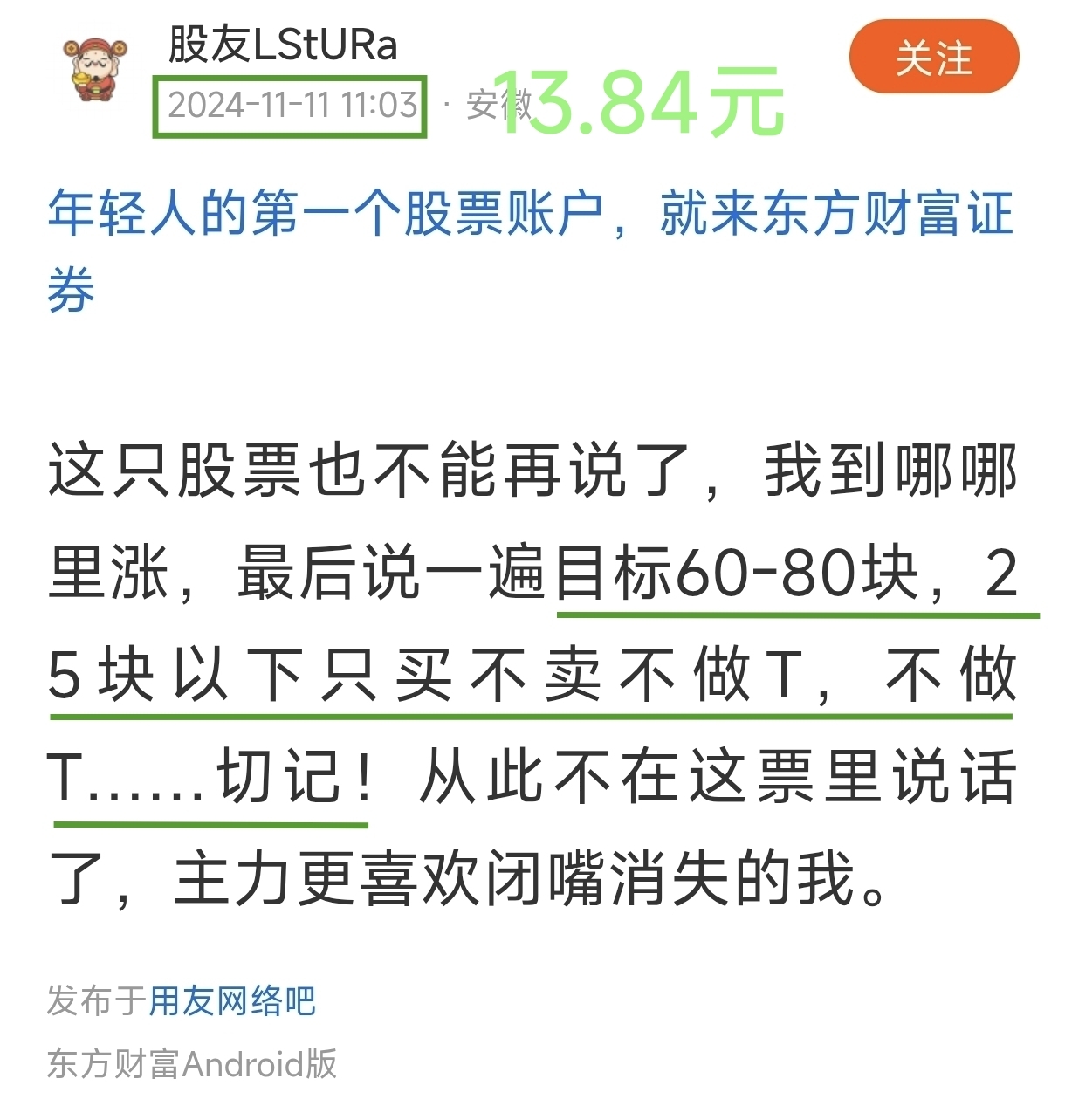 二,忽悠目标60-80块,25块以下只买不卖不做T,不做T~