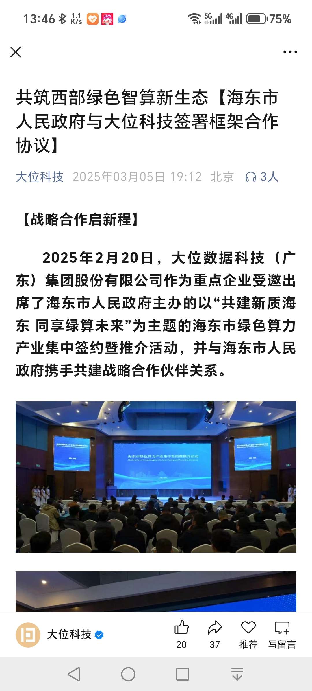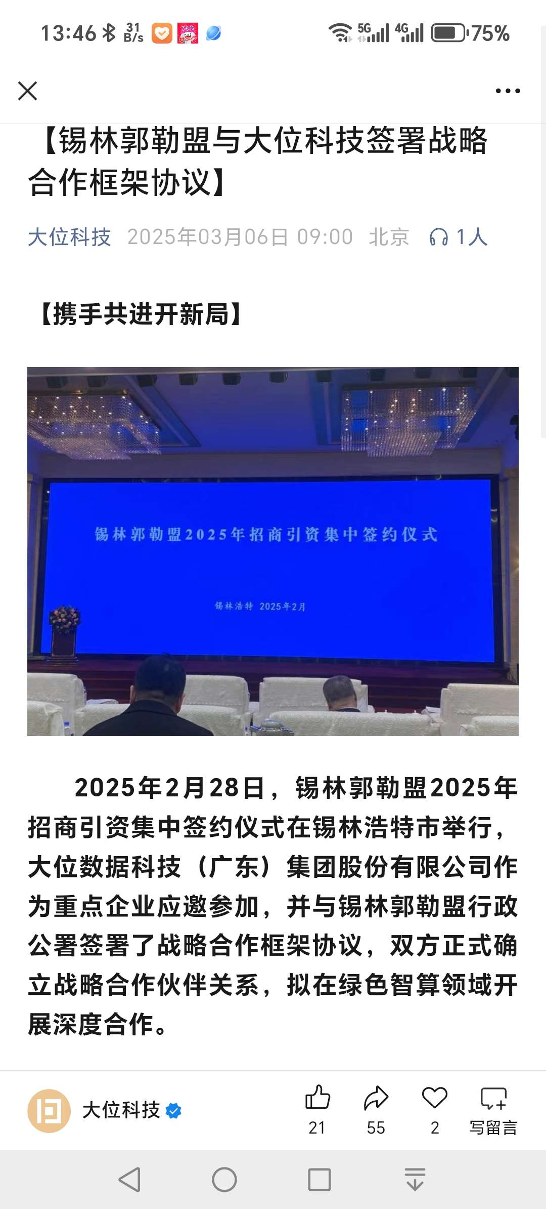 【携手共进开新局】2025年2月28日,锡林郭勒盟2025年招商引资集中签约仪式在锡林浩特市举行,大位数据科技(广东)集团股份有限公司作为重点企业应邀参加,并与锡林郭勒盟行政公署签署了战略合作框架协议,双方正式确立战略合作伙伴关系,拟在绿色智算领域开展深度合作。