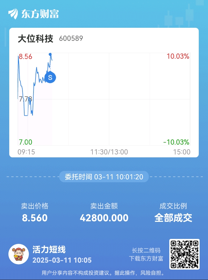 $大位科技(SH600589)$ 挂的涨停卖掉了。