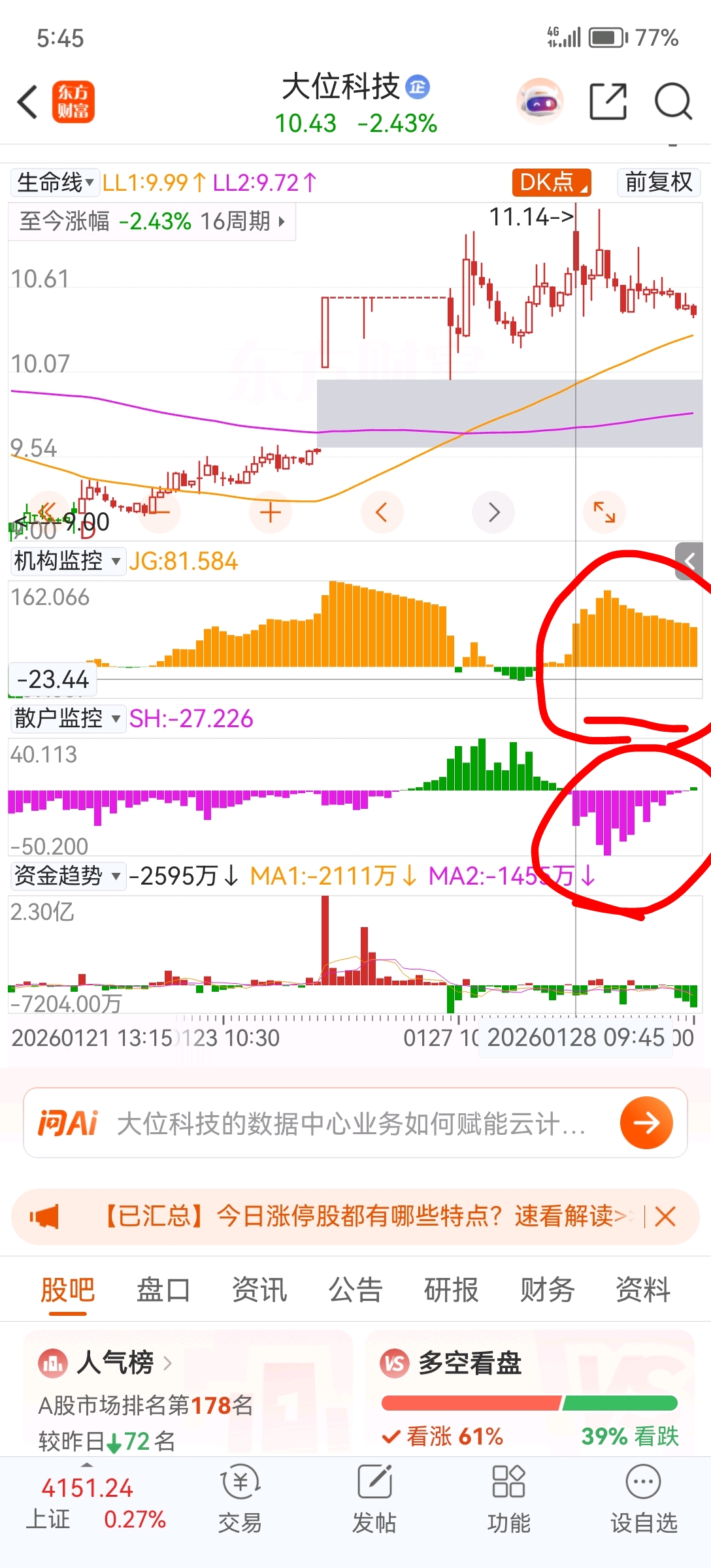 看全天机构和散户流入的资金情况,机构在买入,散户卖出,更像是在洗盘,不知是否准确