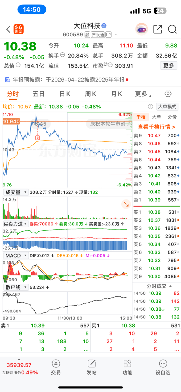 $大位科技(SH600589)$ 卖了利欧买了你哭死我了
