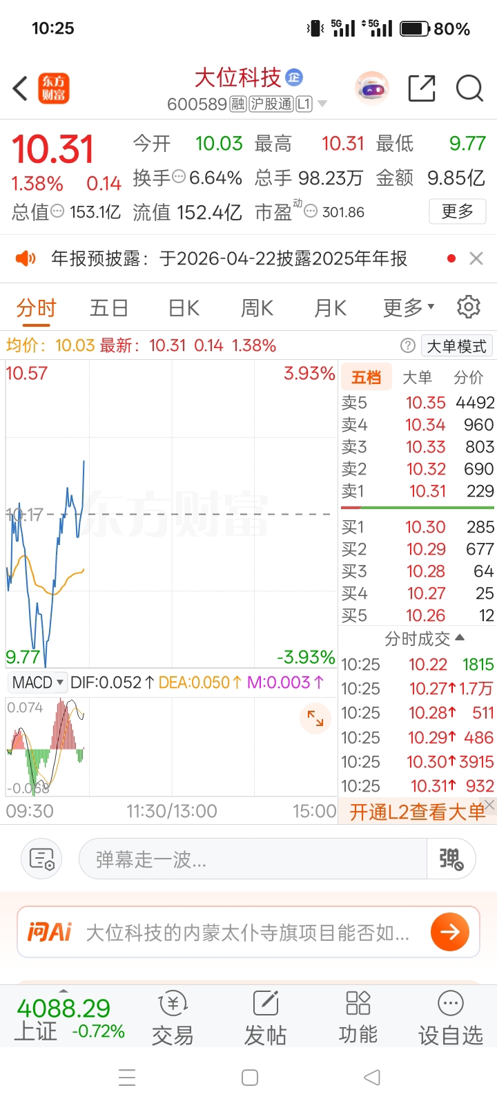 $大位科技(SH600589)$ 大位继续期待,触底反弹,强者恒强!!10.33附近上车开怼!坐稳扶好!!