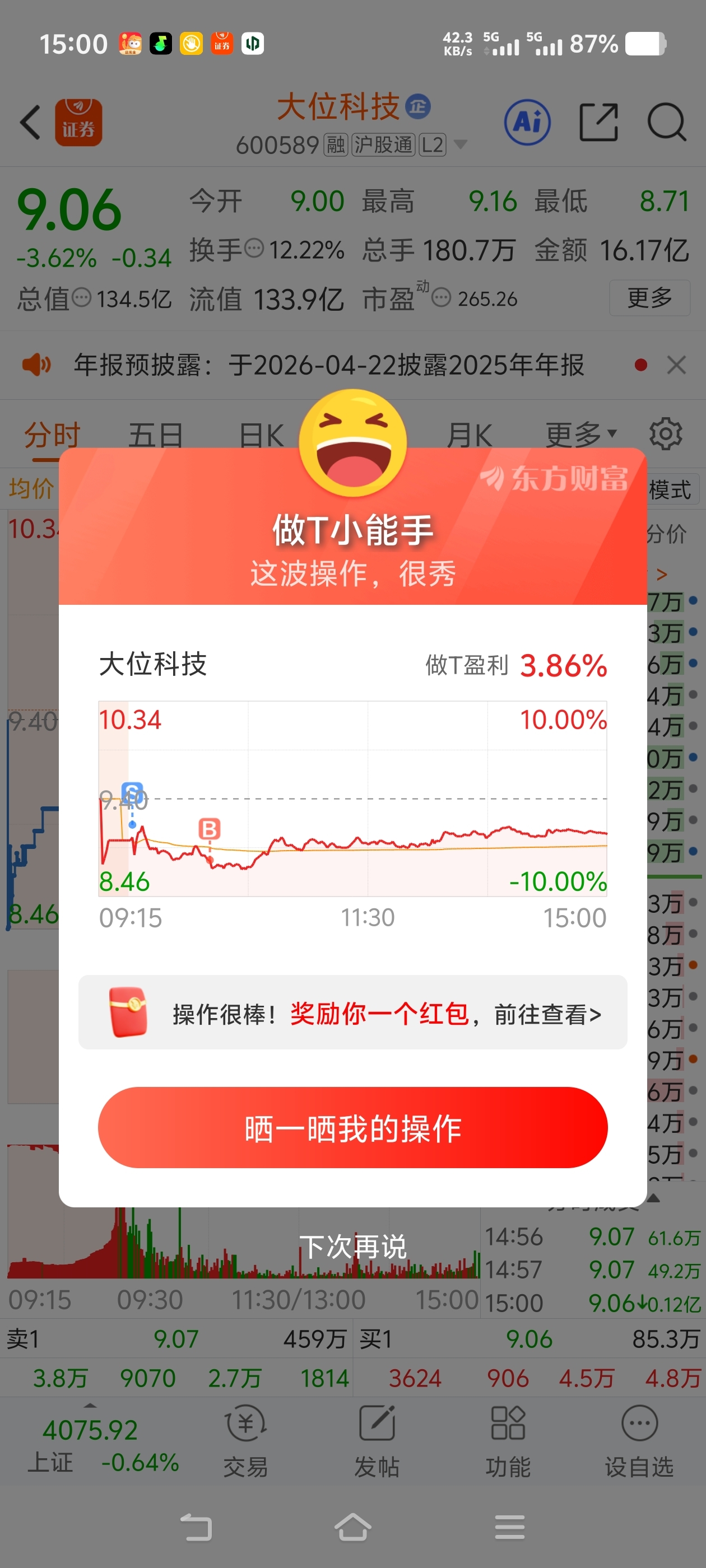 $大位科技(SH600589)$ 今天主要是咽不下这口气,不然不会T回来