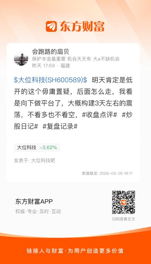 $大位科技(SH600589)$ 明天肯定是低开的这个毋庸置疑,后面怎么走,我看是向下做平台了,大概构建3天左右的震荡,不看多也不看空,#收盘点评# #炒股日记# #复盘记录#