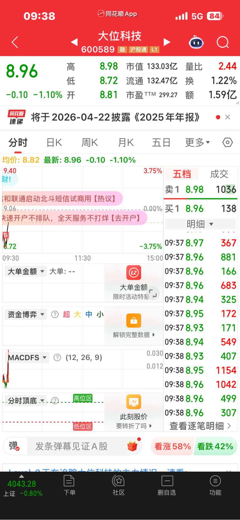 $大位科技(SH600589)$ 8.78买入,长点就扔