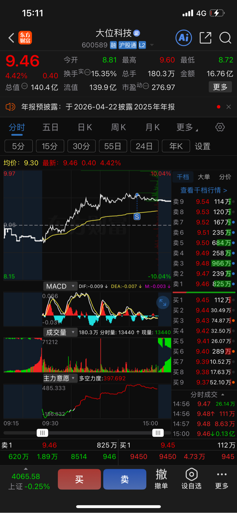 $大位科技(SH600589)$ 说一下我卖出的理由 日内反抽几次都没过五天线,太弱,先出来看看,宁错过,不做错