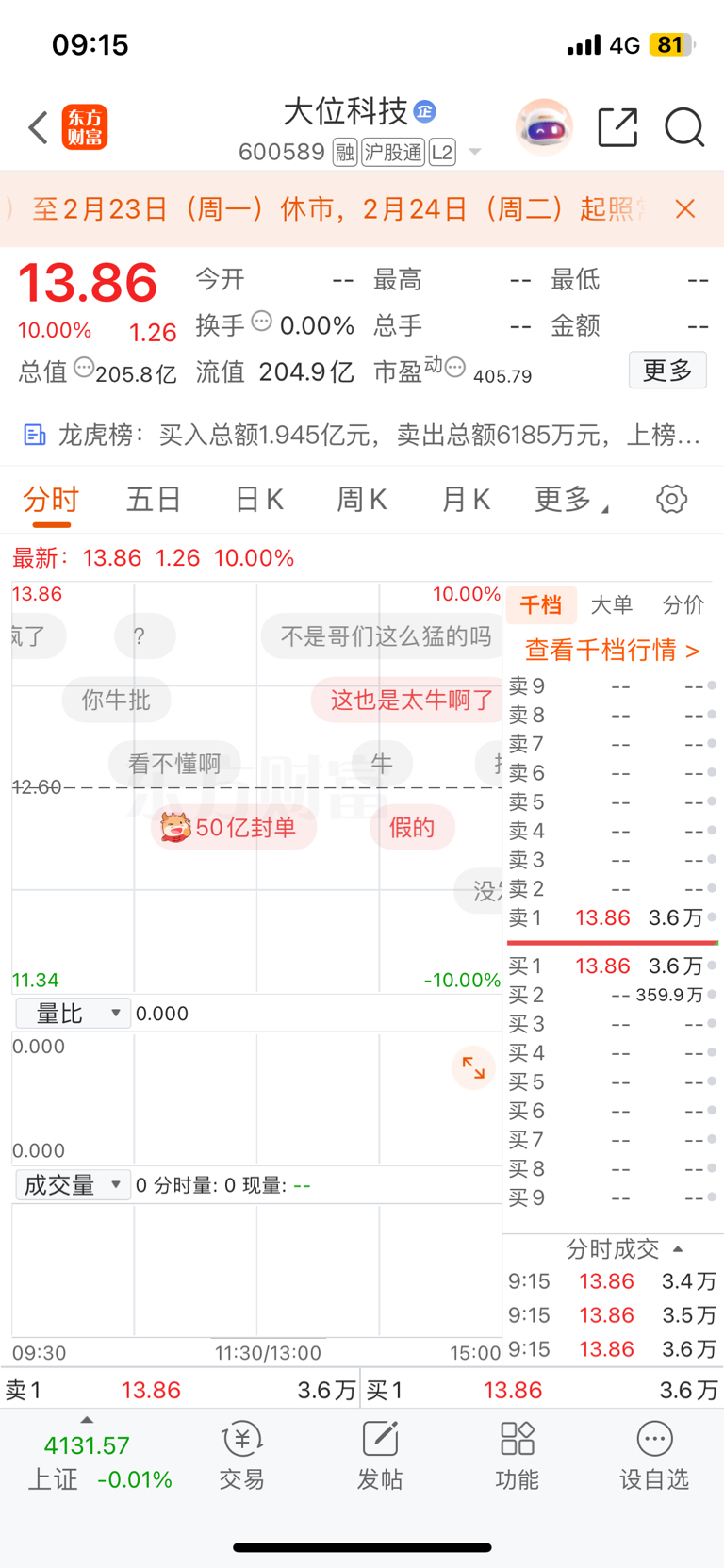 $大位科技(SH600589)$ 早上这个50多亿封单量确实牛啊,后续看涨,一起加油