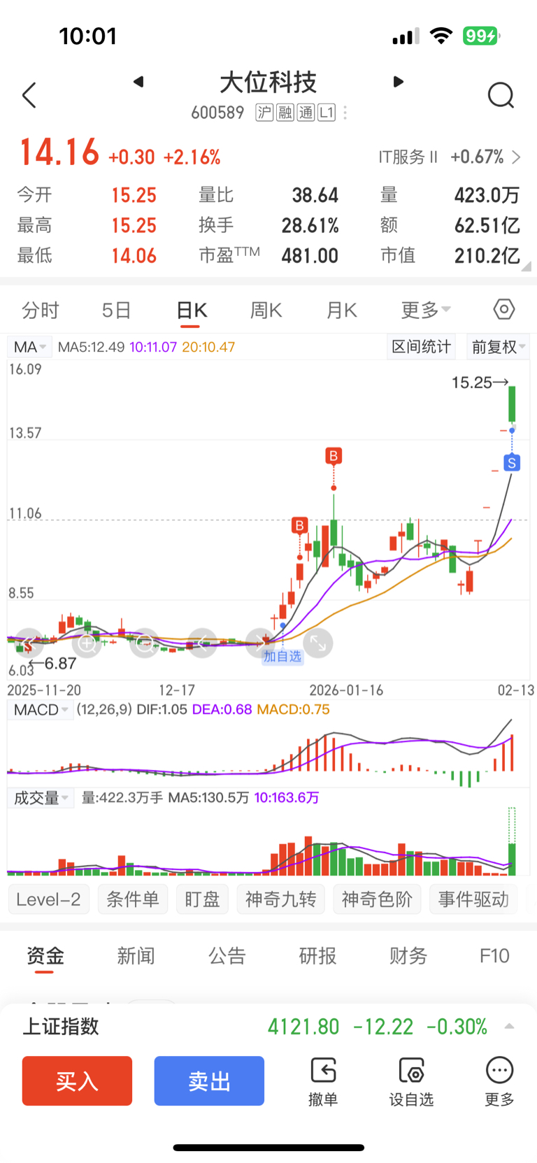 $大位科技(SH600589)$ 59个点,吃爽了,拜拜了,感谢主力大红包