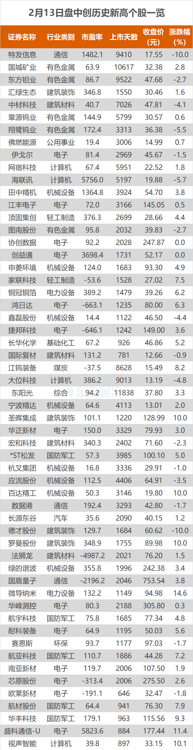 2月13日,A股今日迎来长假前最后一个交易日,三大指数集体回调。截止收盘,沪指跌1.26%,收报4082.07点;深证成指跌1.28%,收报14100.19点;创业板指跌1.57%,收报3275.96点。东方财富Choice数据显示,今日有56只个股盘中股价创历史新高,分别为大位科技、特发信息等。