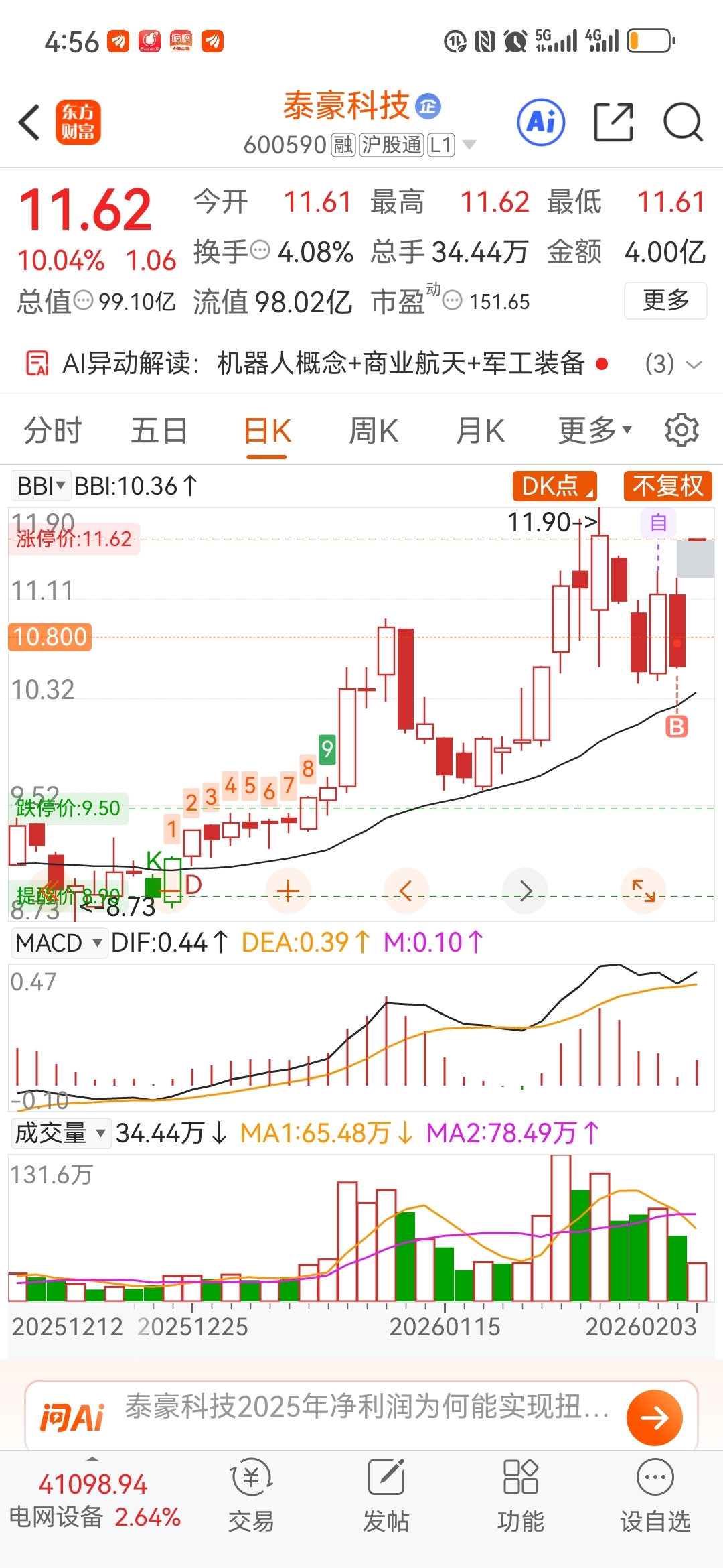 $泰豪科技(SH600590)$ 昨天进的,搏他今天高开,超预期了,但只买了四成仓。