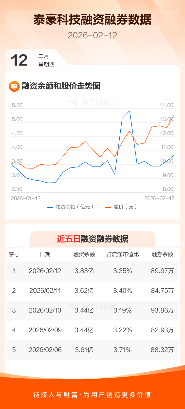 交易所最新数据显示,泰豪科技于2026年2月12日获融资买入1.45亿元,融资偿还1.24亿元,当日融资净买入2109.06万元。目前,该股融资余额3.83亿,占流通市值比例为3.35%。