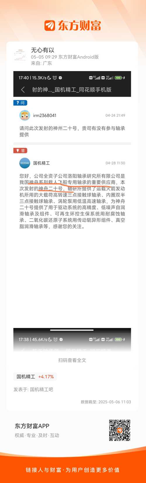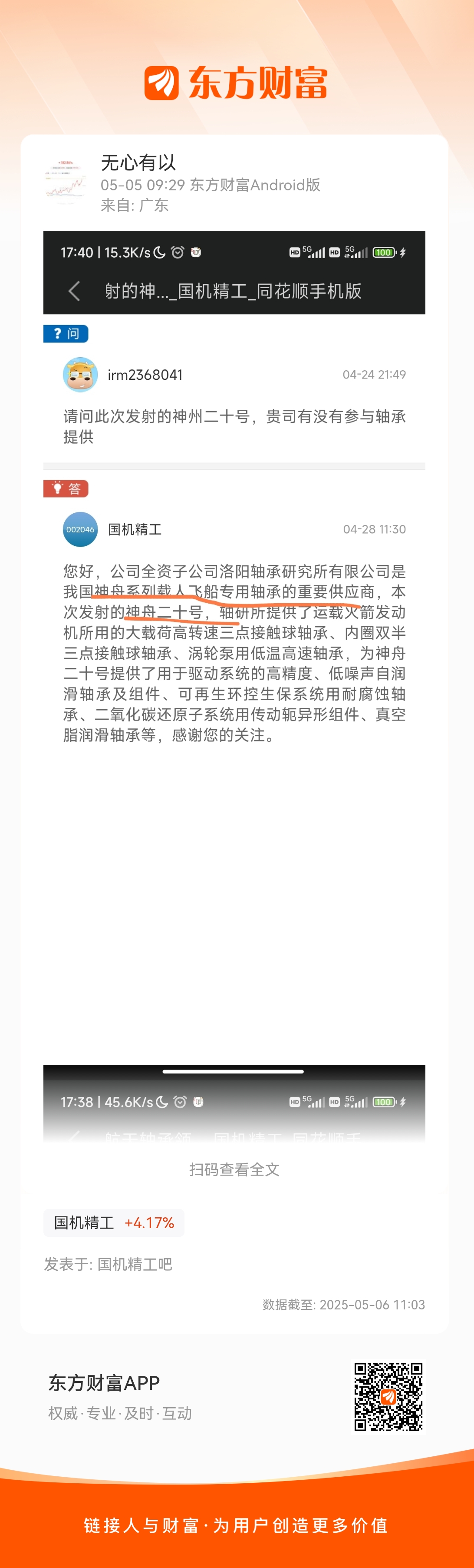 $国机精工(SZ002046)$ 神州系列载人飞船轴承,航天轴承领域市占率90% + 产品参与国产大飞机C919 + 外骨骼机器人 + 精密机器人轴承 + 新剑传动供应商 + 芯片制造领域的金刚石工具、超硬材料磨具产品 + 培育钻石品牌黛诺(DEINO)在小红书、京东、淘宝等线上渠道销售。