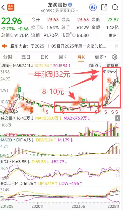$龙溪股份(SH600592)$ 月线看,一年时间涨到历史高位,8-10元涨到32,大家自己看,懂的都懂