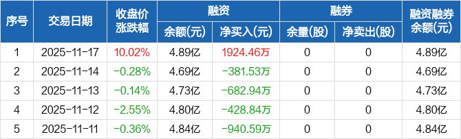 融资方面,当日融资买入1.11亿元,融资偿还9178.26万元,融资净买入1924.46万元。融券方面,融券卖出0股,融券偿还0股,融券余量0股,融券余额0元。融资融券余额合计4.89亿元。