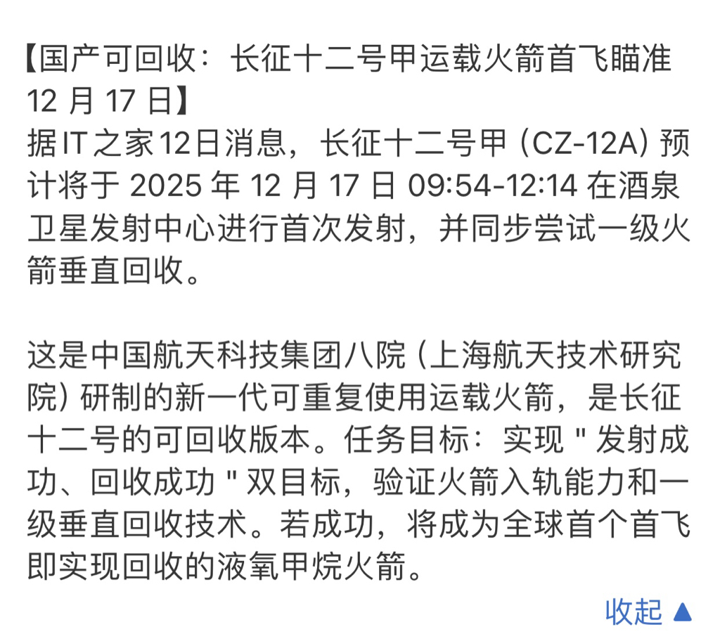 $龙溪股份(SH600592)$ 长征十二号甲周三上午十点左右发射