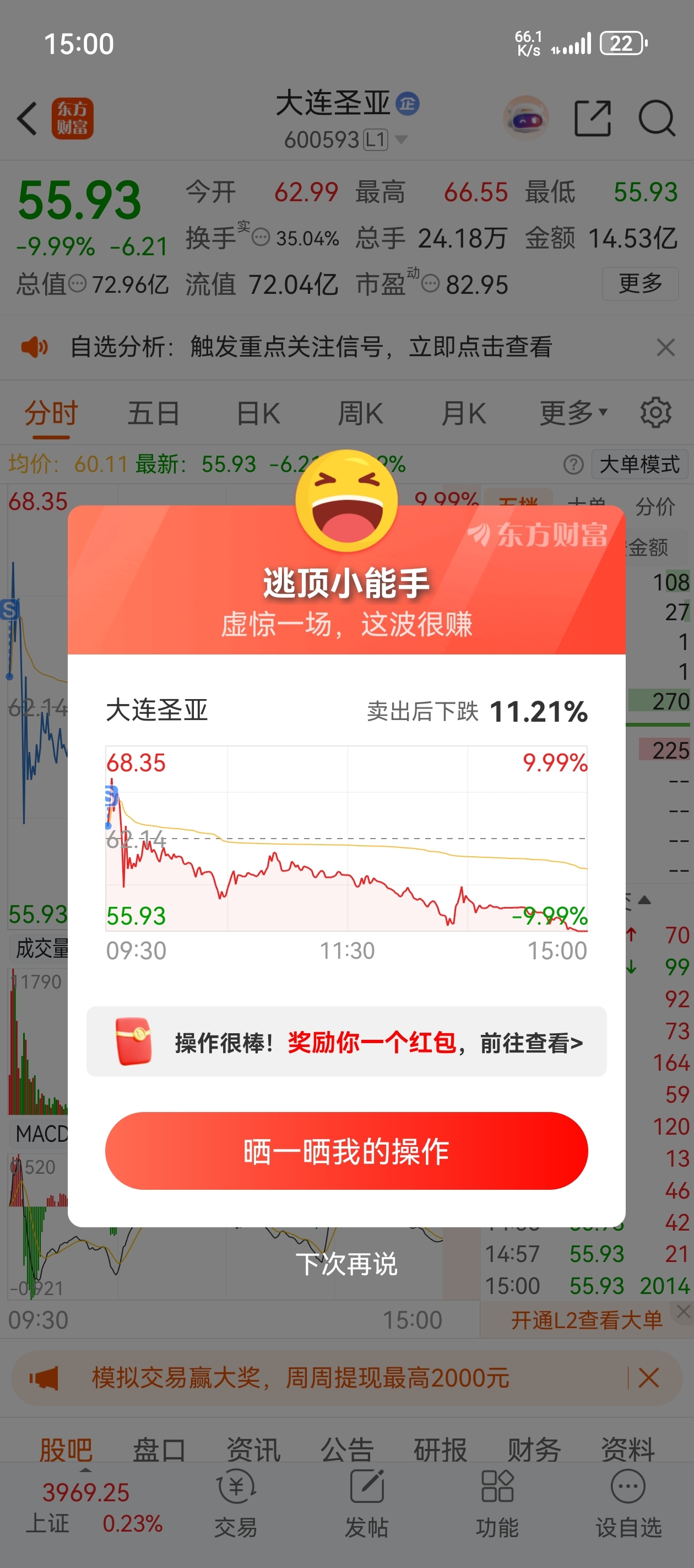 $大连圣亚(SH600593)$ 还好早上跑了