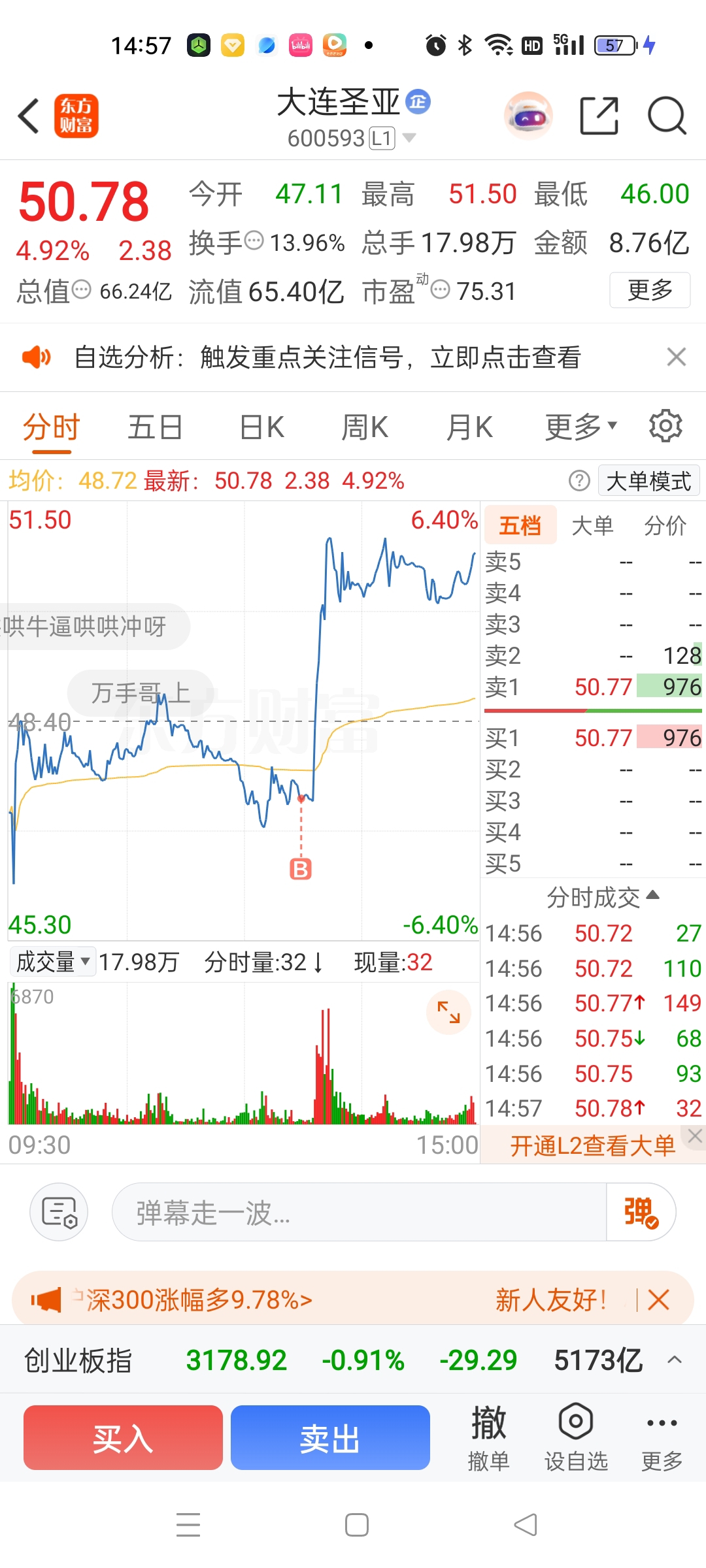 $大连圣亚(SH600593)$ 今天步步高卖了16万,买了三万的大连,我早都想买了,可惜之前被套了,错过两个月行情,这次要求不高,能到55我就卖了