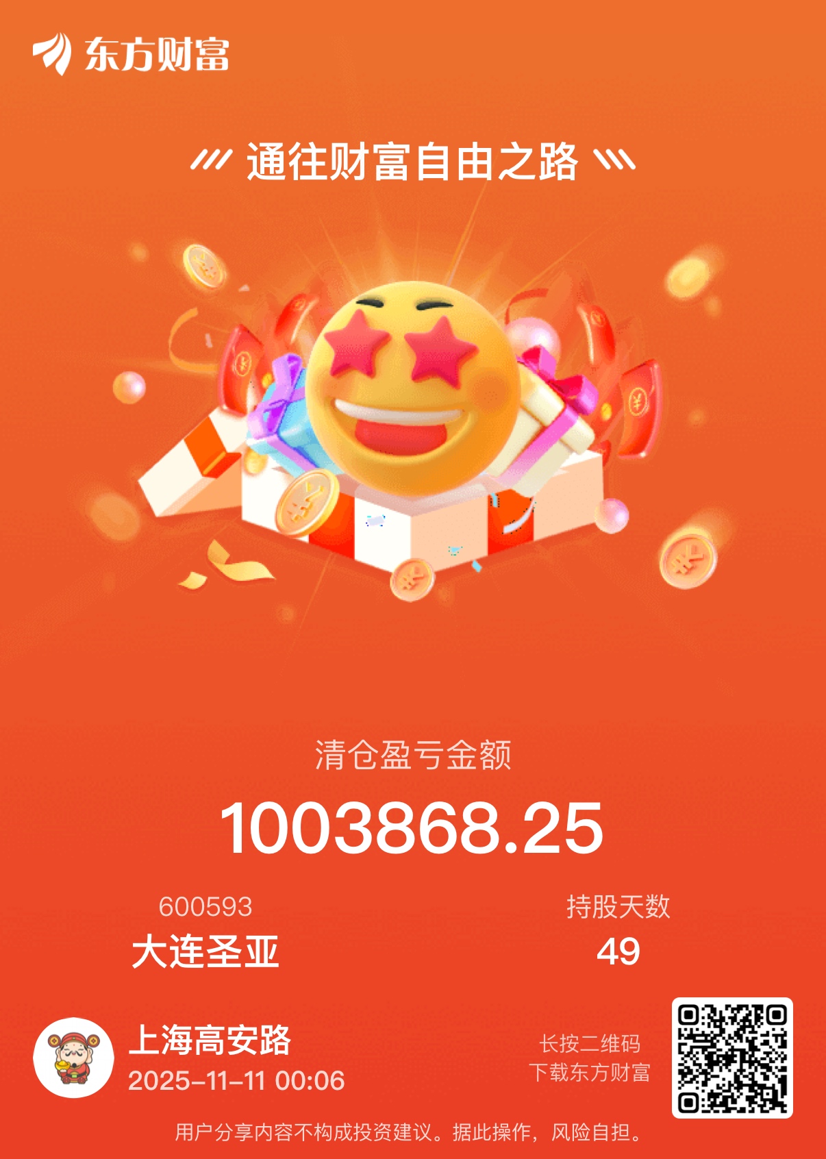 $大连圣亚(SH600593)$ 在一只股票上挣了100万,知足了