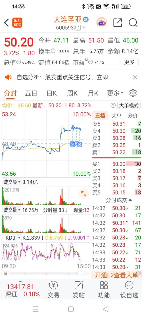 大连圣亚(SH600593)$外盘大于内盘,资金净流出,典型的拉高出货,下跌中继,又会回到46元,赚了的先落袋,留一手继续炒。