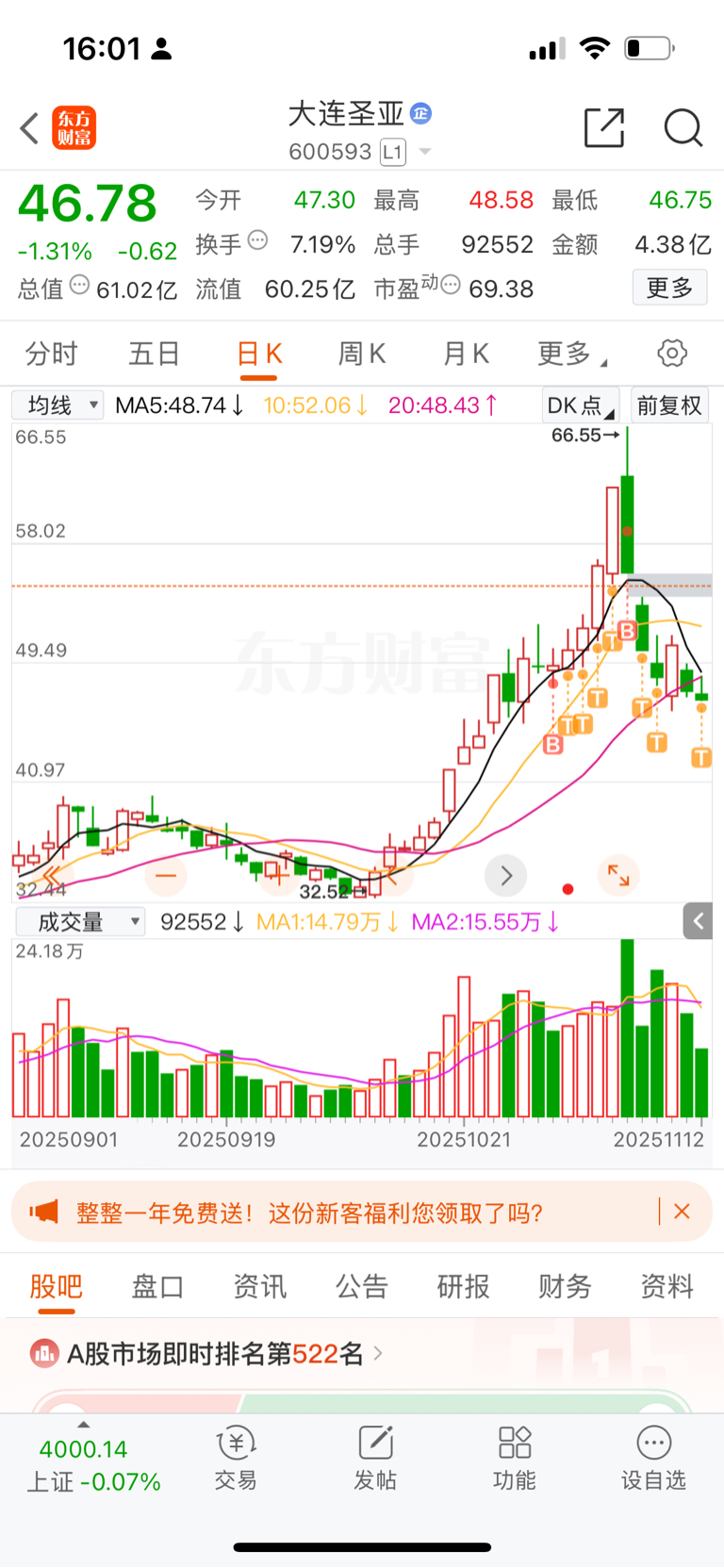 $大连圣亚(SH600593)$ 今天又做了一个T虽然下跌了没有亏钱也没有赚钱。