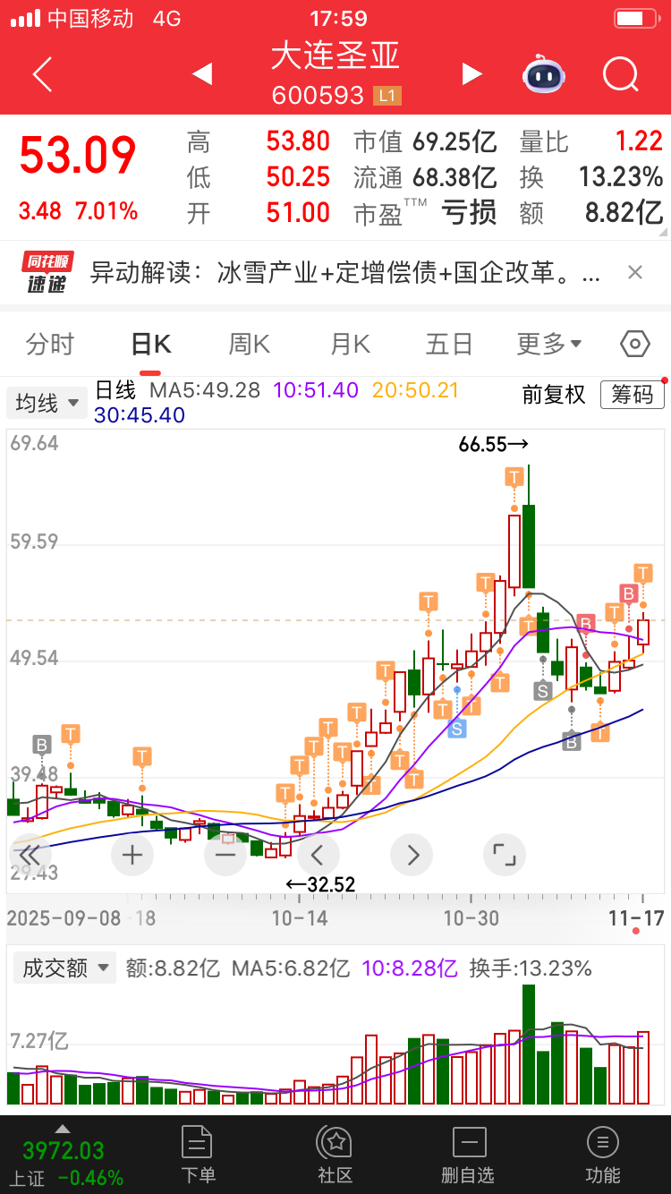 $大连圣亚(SH600593)$ 高价股涨的就是快,眨眼又要冲100元大股了,今天被洗下车的太多人了,明天上涨的动力又有了,我就在57附近埋手单,嘿嘿,我真是个大滑头