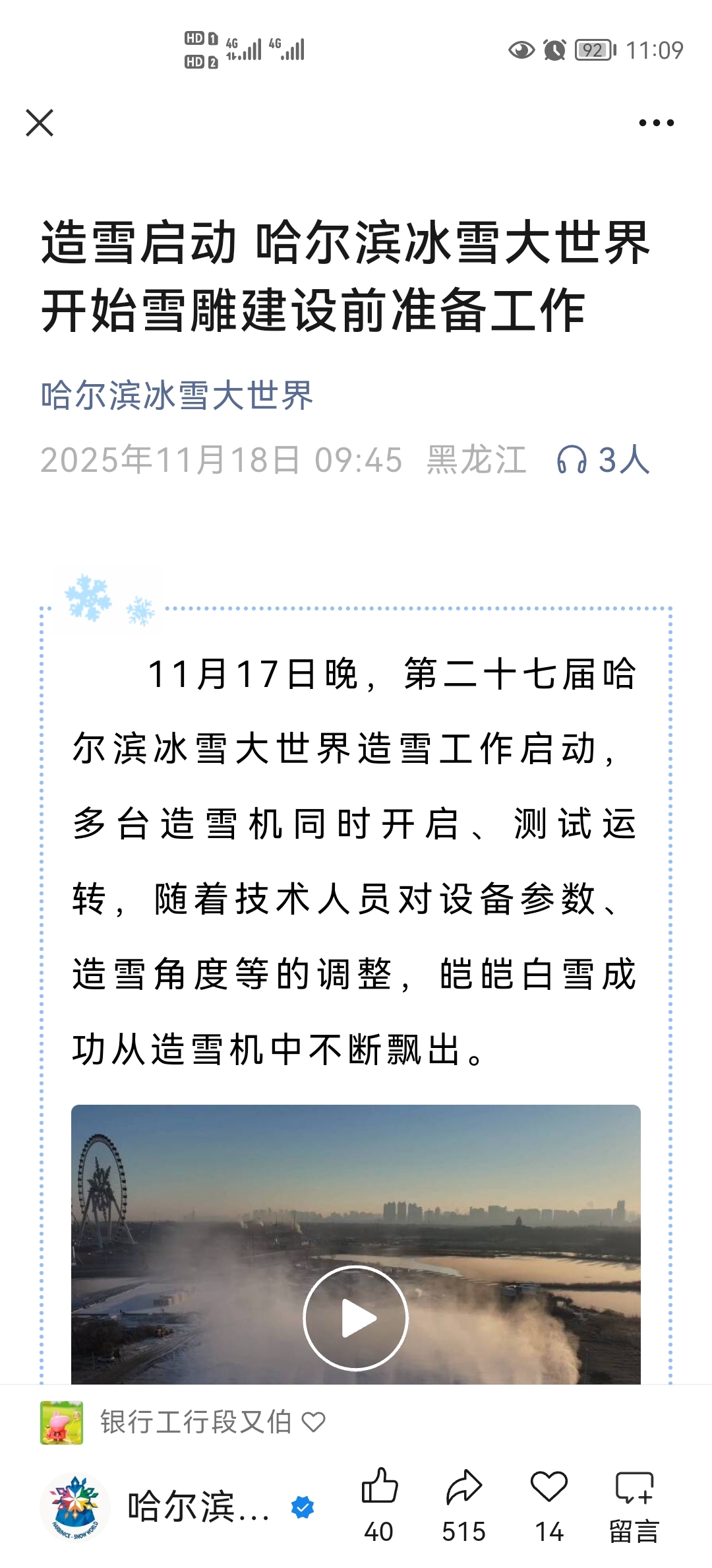 $大连圣亚(SH600593)$ $晶雪节能(SZ301010)$ $雪人集团(SZ002639)$ 哈尔滨冰雪节开始造冰雕了