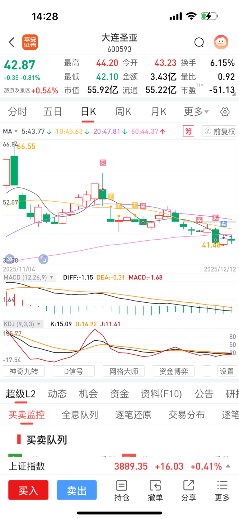 $大连圣亚(SH600593)$ 大家别看图以为是见底了,实际上去没有底的,之前45块多46块的时候强支撑位已经跌破了,只要在下跌中就没有低只有更低,如果真想买就去买冰山冷热,追雪人的话只能说风浪越大鱼越贵,完全没有必要买东北双熊,如果你真想买你要要等他那天大涨5个点的时候再来,不涨5个点以上都是勾庄在骗炮的,就怕雪人那天崩了就会把这东北双熊带崩了,大连下跌起来就是龙头