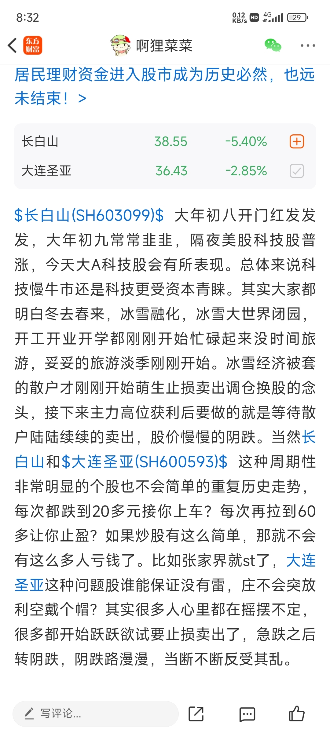 $大连圣亚(SH600593)$ 不年不节开工开学春雨绵绵迎旅游淡季$长白山(SH603099)$ 。春节九天大长假刚过完,你老板会放假让你去旅游吗?孩子上学了还有时间旅游吗?春节期间钱不少花,还有闲钱旅游吗?冰雪融化,你还愿意那么远跑东北旅游吗?