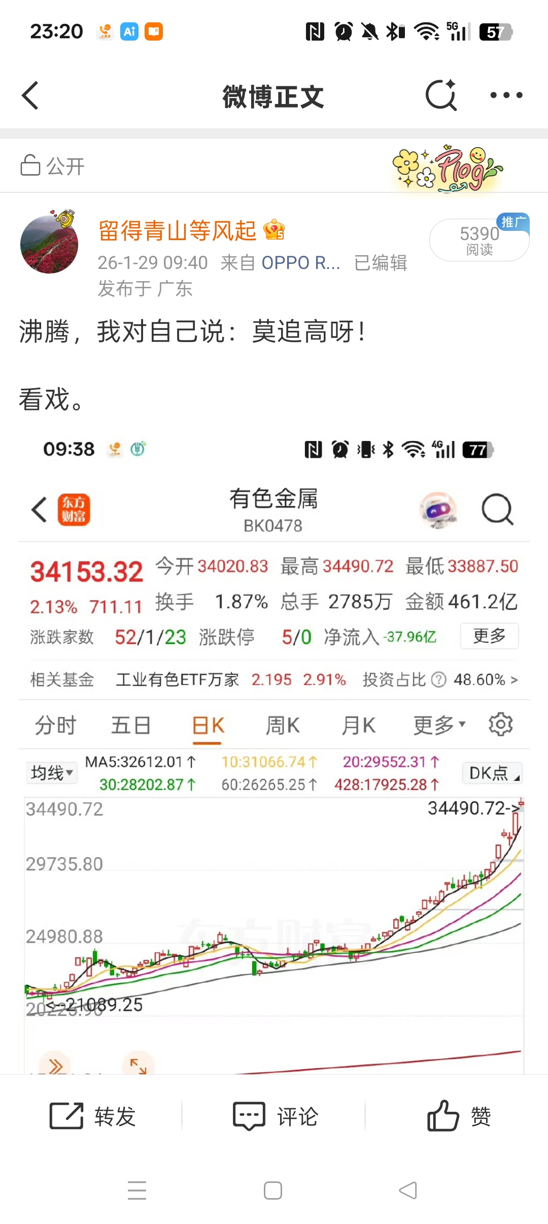 年报预告的次日的大跌没有吓到我,28 29有色金属全板块高潮,尤其是垃圾股白银有色这种瞎炒吓跑了我。